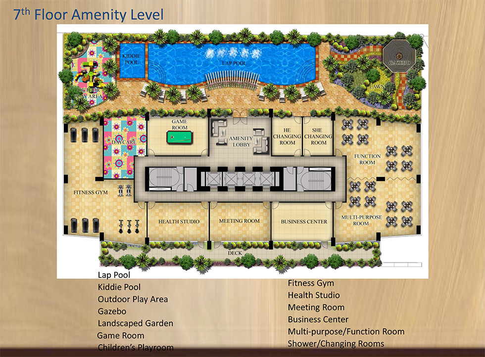 Lap Pool Kiddie Pool Outdoor Play Area Gazebo Landscaped Gardens Fitness Gym Business Center Health Sudios Children’s Playroom Game Room Meeting Room Changing Rooms Multi-Purpose Room Function Room